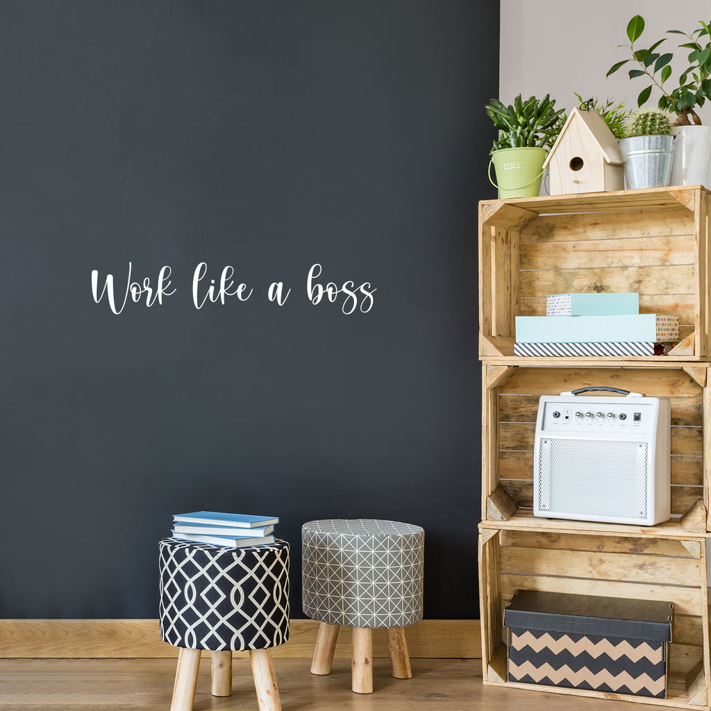 This awesome optimistic & motivational decal quote "Work Like A Boss"; is the perfect touch for your school or office. Use it for your living room; classroom; playroom or anywhere you want to bring some extra positive decoration. It's a vinyl sticker that is easy to put on any smooth and dry surface. Our modern designs don't just brighten up the room; but brighten up the day. Using top of the line vinyl across all of our production allows us to be the leaders in quality and design.